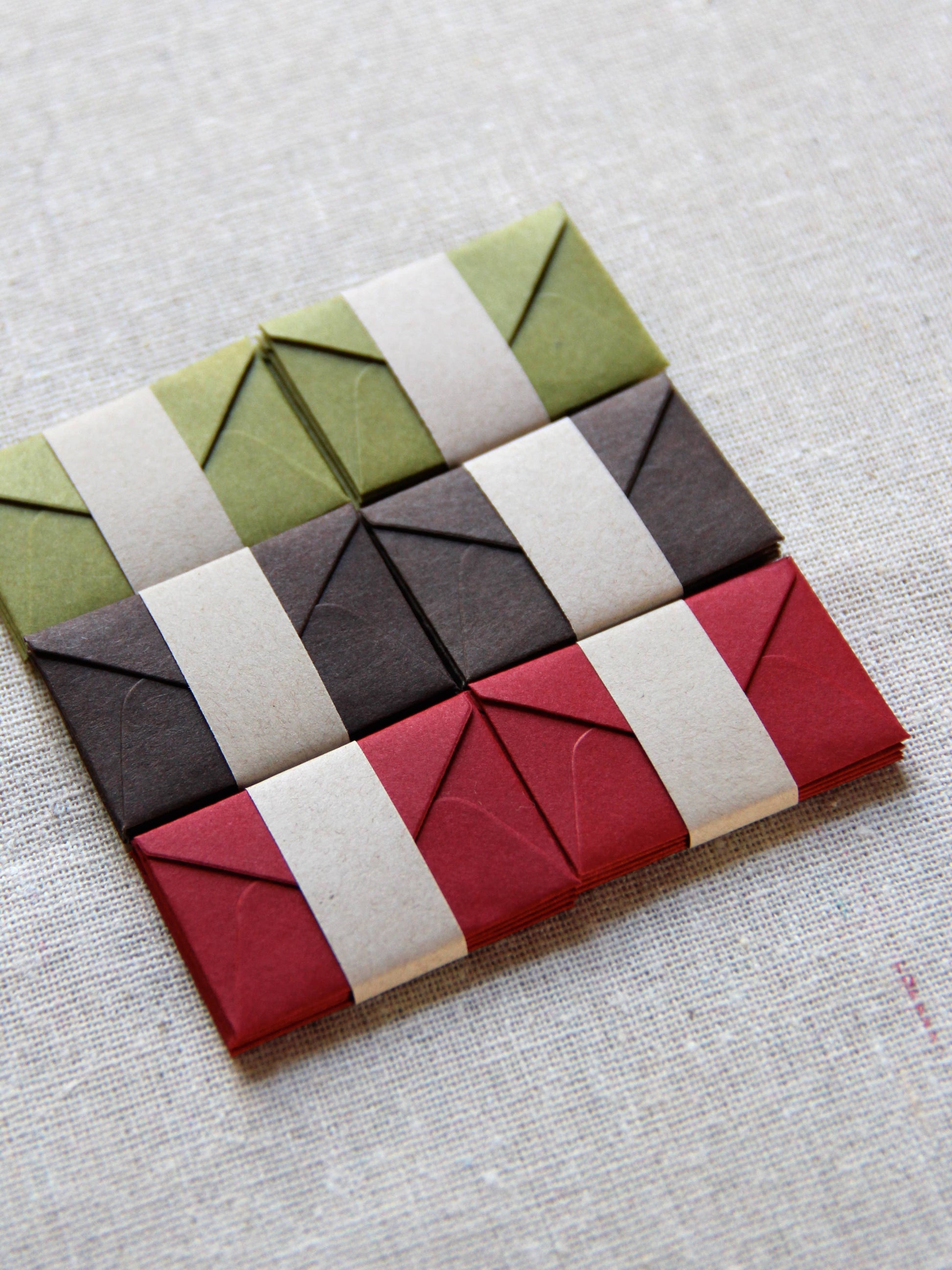 Set of 12 tiny envelopes, hand-assembled from moss green, brown and holiday red paper.